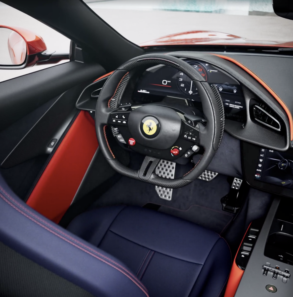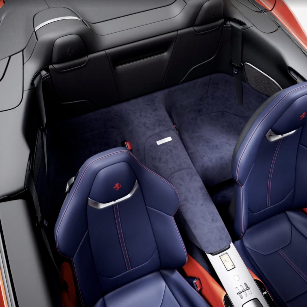 À l’instar de la Ferrari Amalfi, l’habitacle présente un double cockpit et une interface conducteur-voiture repensée. Parmi les éléments clés, citons le volant à boutons physiques, le retour du bouton de démarrage emblématique, l’écran central intégré et des commandes conçues pour une utilisation intuitive, même en conduite sportive. La configuration 2+ optimise la praticité, avec des sièges arrière adaptés aux voyages avec enfants ou permettant d’augmenter la capacité de chargement. Enfin, un déflecteur d’air intégré au dossier de la banquette arrière, actionnable par simple pression d’un bouton, améliore le confort en réduisant les turbulences lors de la conduite à ciel ouvert.